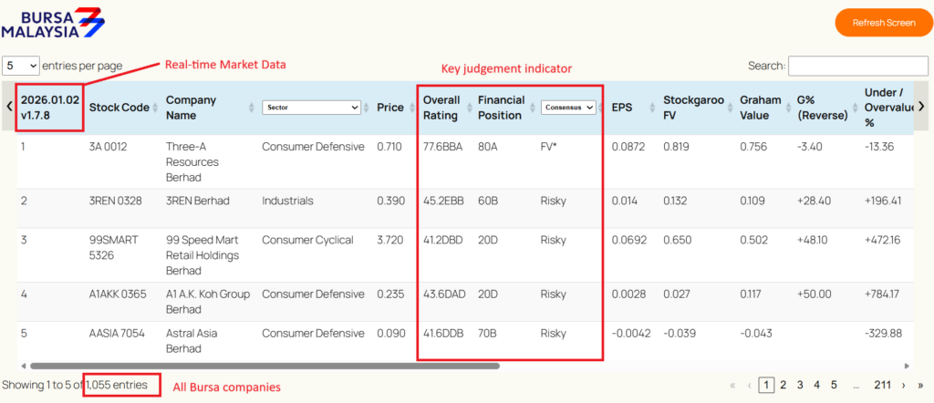 | 1. Start investing 2. Open an account (Bursa Malaysia CDS & others) 3. Subscribe Stockgaroo Screener – Bursa, NYSE, SGX & ASX for just $0.55/day (weekly updates) – Find undervalued stocks in seconds (you know what to do) 4. Build your portfolio (5 – 20 stocks) | 💡Tips: Use the Screener to look for stock that: – Consensus: FV*** – Overall Rating: min. score greater than 70 – Financial Position: min. score greater than 70 – Cashflow: +OCF & +FCF Keep trying till you get positive portfolio. |