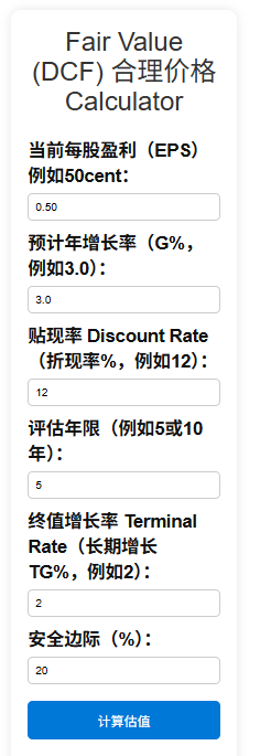 认识合理价格:我们有智能合理价格计算器,很方便计算。举例:当 EPS 3.89 分,成长=0% 合理价格是每股 0.37;如果 EPS 25 分,成长=0% 合理价格是每股 2.35。新手们可以亲手点击试试看